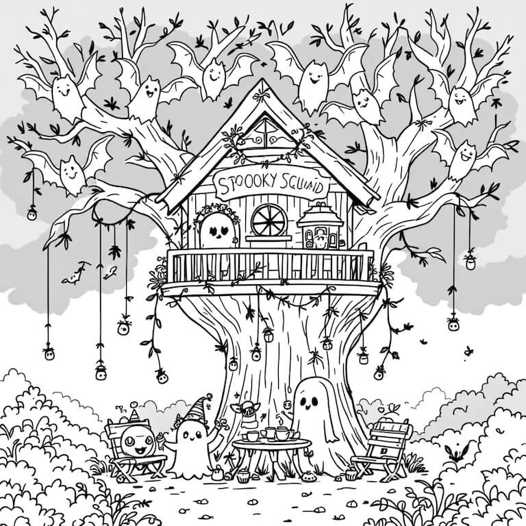Create a Halloween treehouse coloring page with bold outlines showing a cozy spooky clubhouse decorated with jack-o'-lanterns, friendly bats hanging from branches, ghost children having a tea party, and candy corn growing on vines, child-friendly design with clear spaces for coloring