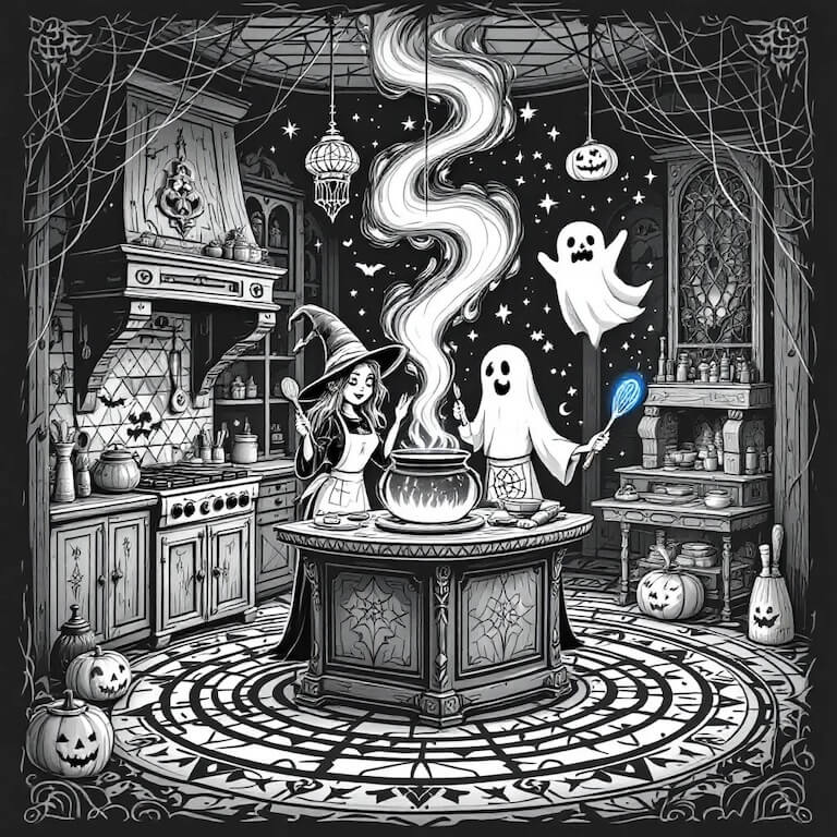 Create a Halloween baking scene coloring page in black and white, featuring witch and ghost chefs making Halloween treats in a magical kitchen, with floating ingredients, enchanted cooking tools, and detailed decorative patterns, using clear lines perfect for coloring.